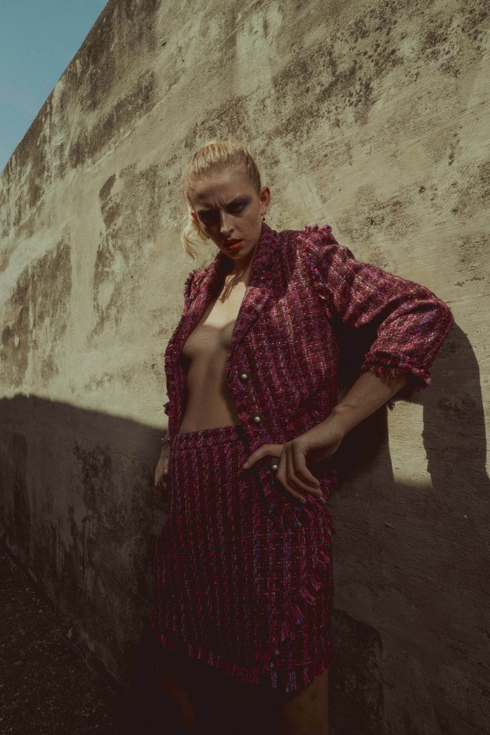 Close-up of a woman's face, showing her blue eyes, nude eyeshadow, deep red lipstick, and slightly parted lips revealing teeth, with a neutral facial expression.